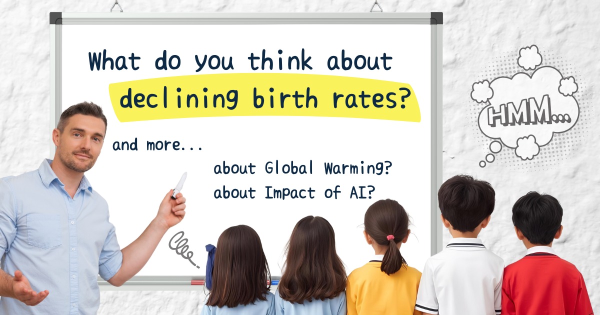 Even when they are asked questions such as “What do you think about the declining birthrate?”, “What do you think about global warming?” or “Do you think IT and AI are good for people?”, many children hesitate and struggle to put their thoughts into words.